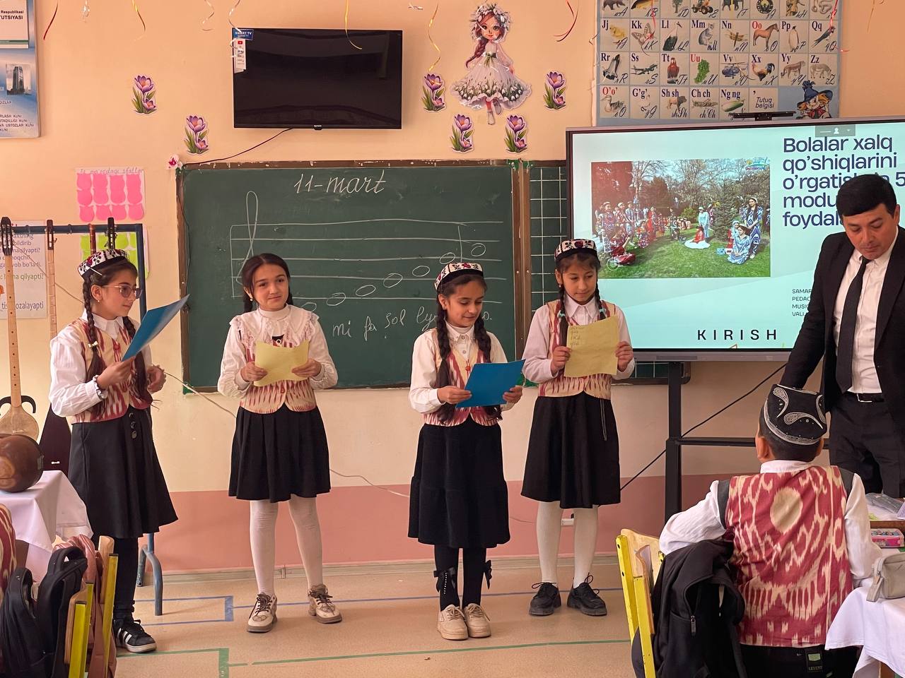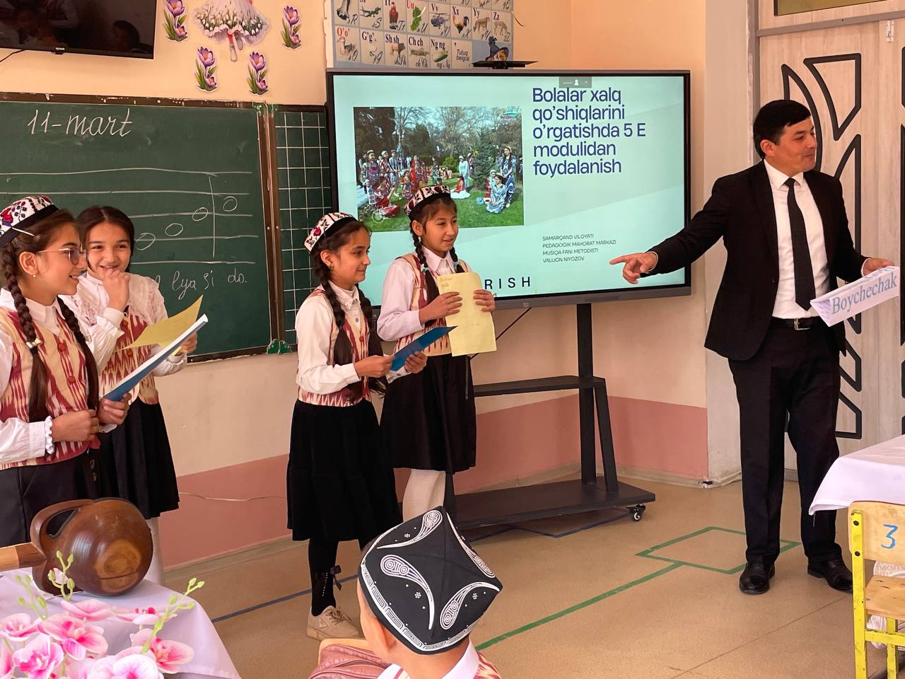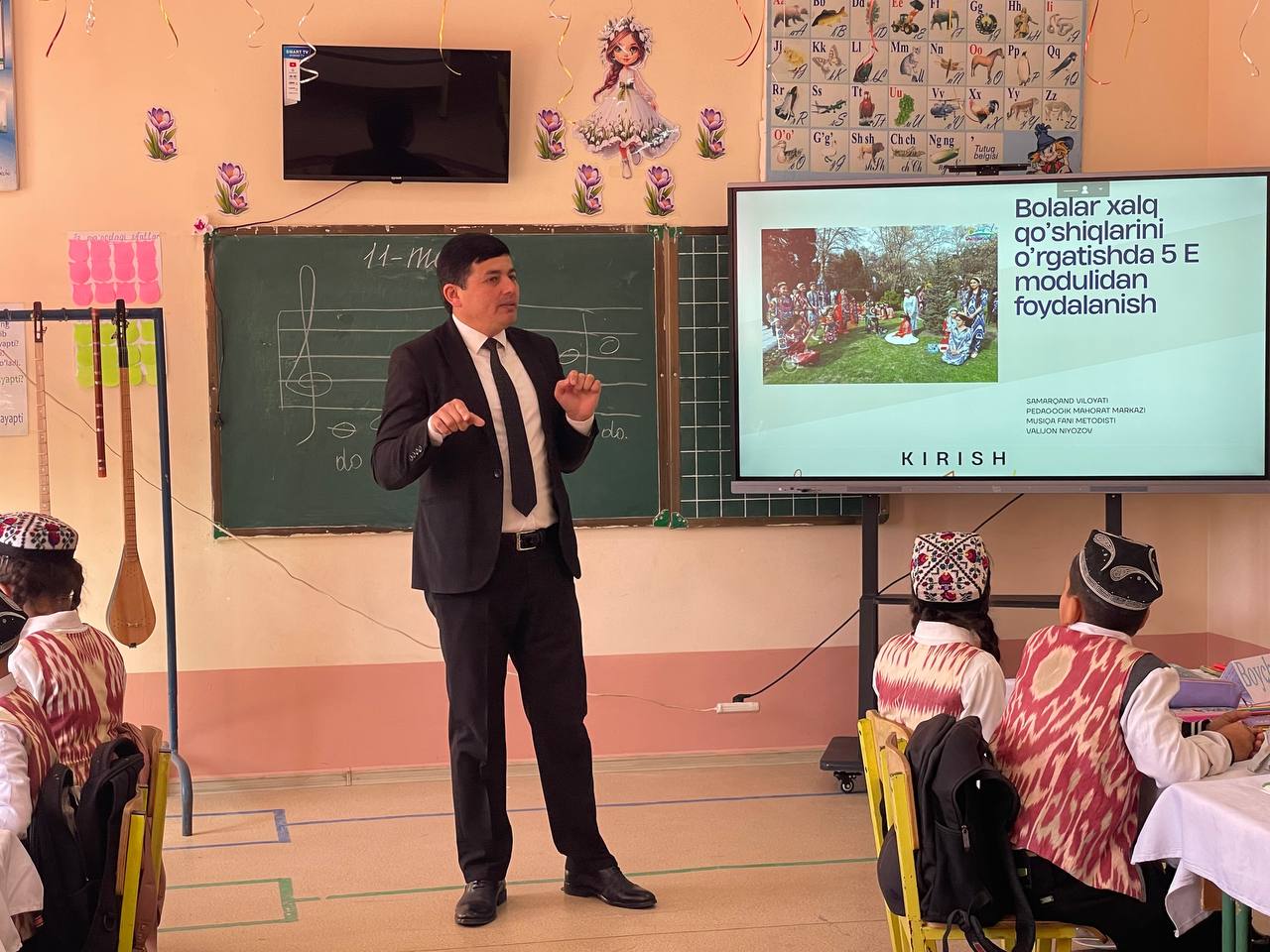 Samarqand viloyati Pedagogik mahorat markazi musiqa fani metodisti V. Niyozov tomonidan Kattaqo‘rg‘on tumanidagi 35-maktabning 4-“B” sinf o‘quvchilari ishtirokida “Bolalar xalq qo‘shiqlarini o‘rgatishda 5E modelini qo‘llash” mavzusida noan’anaviy mahorat darsi o‘tkazildi.