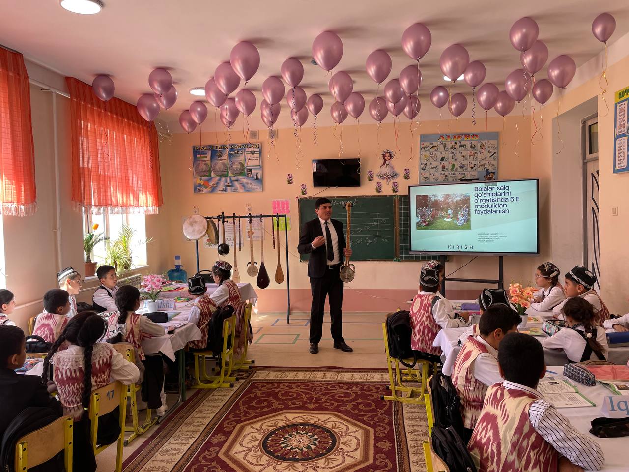 Dars jarayonida o‘quvchilarga xalq qo‘shiqlarini o‘rganishda zamonaviy pedagogik yondashuvlar, xususan 5E modeli asosida ta’lim berish usullari amaliy tarzda namoyish etildi. Mashg‘ulot davomida o‘quvchilar faol ishtirok etib, milliy kuy-qo‘shiqlar orqali musiqiy bilim va ko‘nikmalarini mustahkamlashdi.