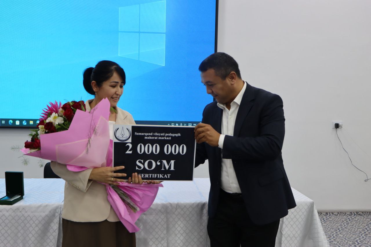 Bugun Samarqand viloyati pedagogik mahorat markazi direktori A.Sobirov, Mo'tabar Fayziyevaga ushbu mukofotni tantanali topshirdi va ta’lim sifatini oshirishga qo‘shgan salmoqli hissasini yuksak e’tirof etdi.