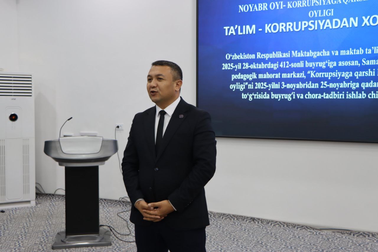Tadbirda Samarqand viloyati Pedagogik mahorat markazi direktori Anvar Sobirov so‘zga chiqdi. U o‘z nutqida ta’lim sohasida halollik va shaffoflik prinsiplari, korrupsiyaga qarshi kurashning dolzarb vazifalari hamda jamoa mas’uliyati haqida to‘xtalib o‘tdi. Shuningdek, u markaz xodimlaridan ushbu yo‘nalishda faol ishtirok va yuksak mas’uliyatlilikni talab etilishini ta’kidladi.