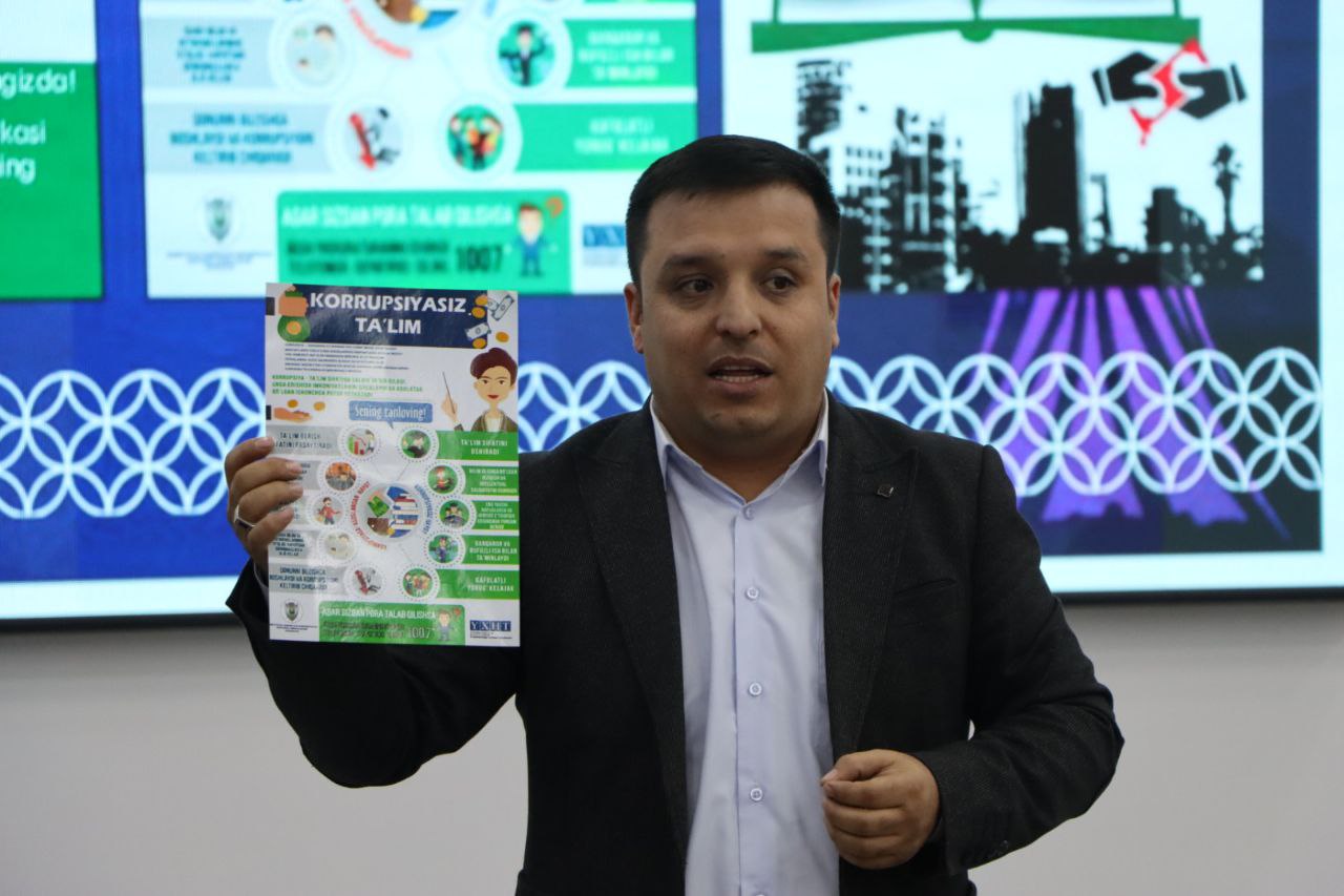 Shundan so‘ng markazning korrupsiyaga qarshi kurashish bo‘yicha mas’uli X. Bekmirzayev tomonidan “Noyabr oyi – Korrupsiyaga qarshi kurashish oyligi” mavzusida ma’ruza qilindi. Unda korrupsiyaning oldini olish mexanizmlari, huquqiy asoslar va ta’lim tizimidagi shaffoflikni ta’minlashga doir muhim jihatlar yoritildi.