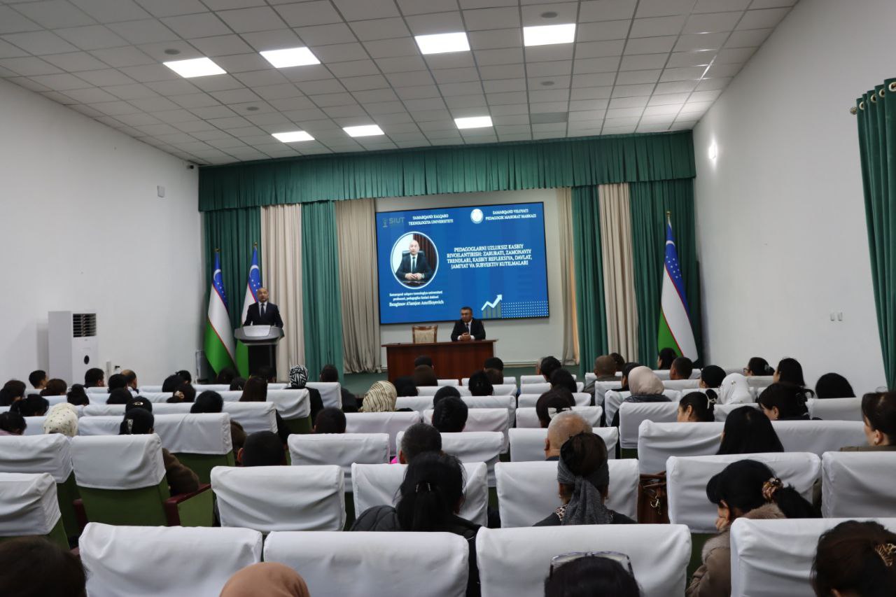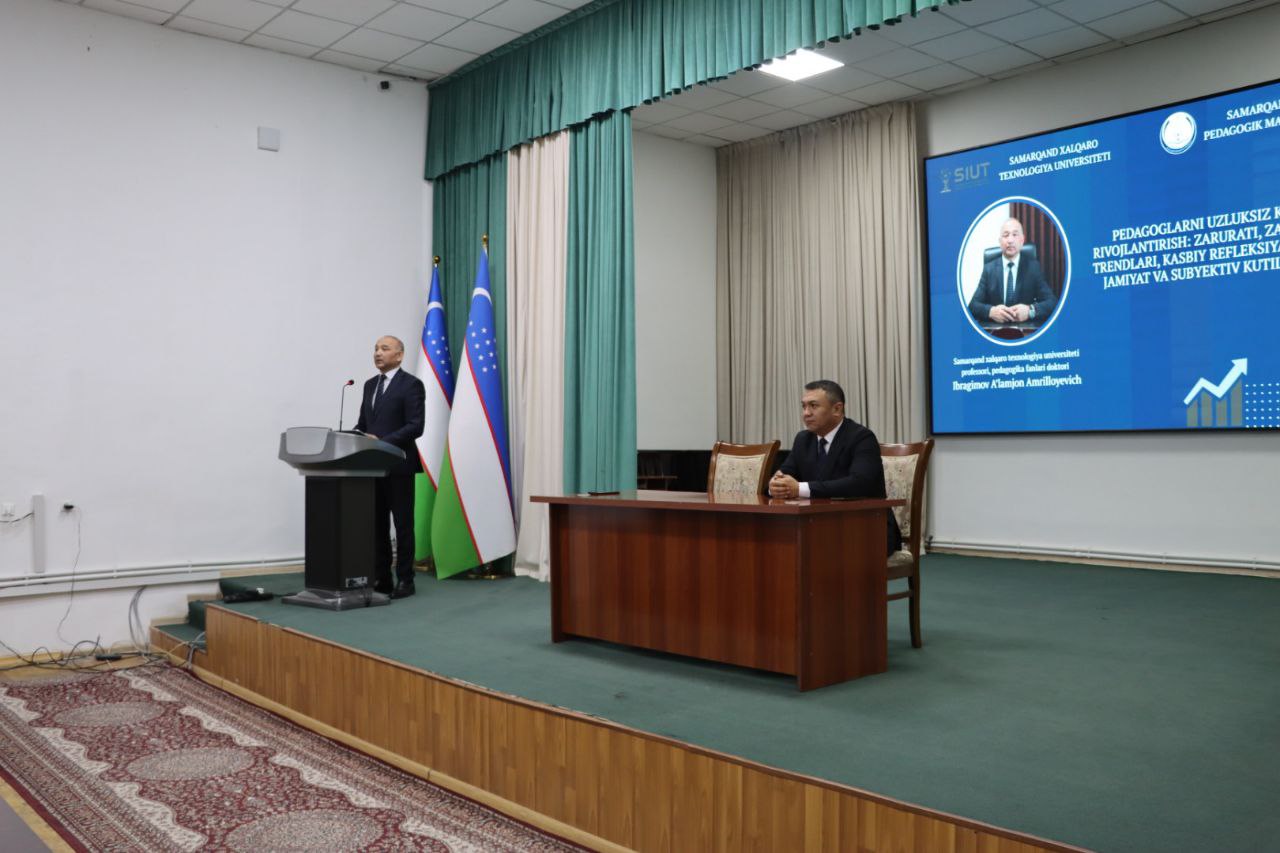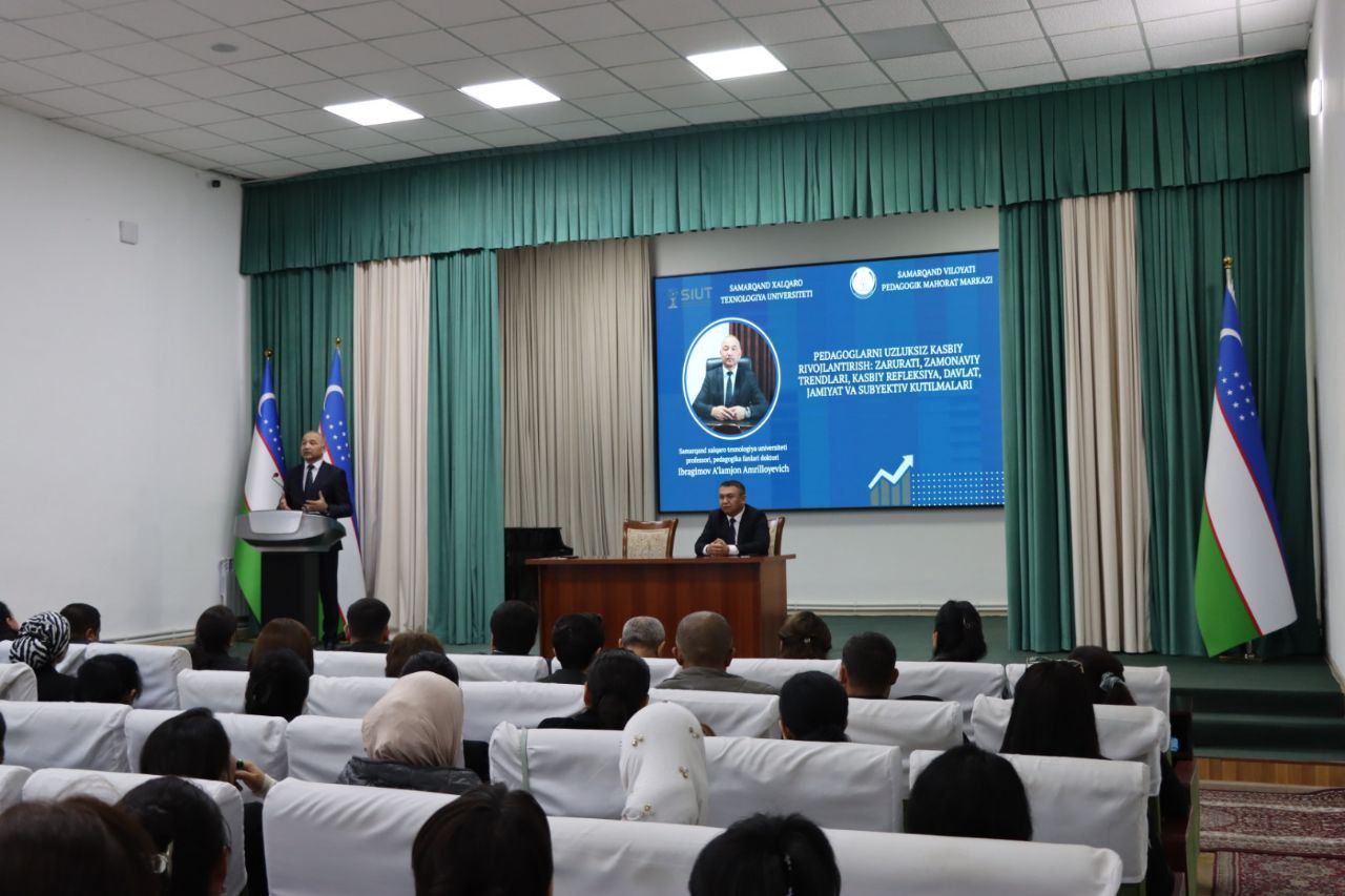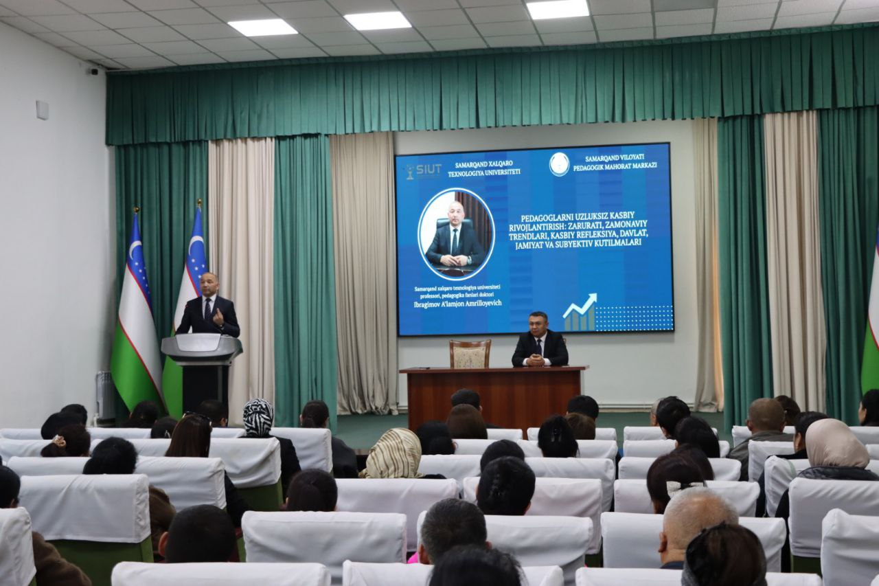 Samarqand viloyati Pedagogik mahorat markazida Samarqand xalqaro texnologiya universiteti Yoshlar masalalari ma'naviy va ma'rifiy ishlar bo'yicha prorektor, professori, pedagogika fanlari doktori Ibragimov Aʼlamjon Amrilloyevich bilan “Pedagoglarni uzluksiz kasbiy rivojlantirish: zarurati, zamonaviy trendlari, kasbiy refleksiya, davlat, jamiyat va subyektiv kutilmalari” mavzusida uchrashuv bo‘lib o‘tdi.