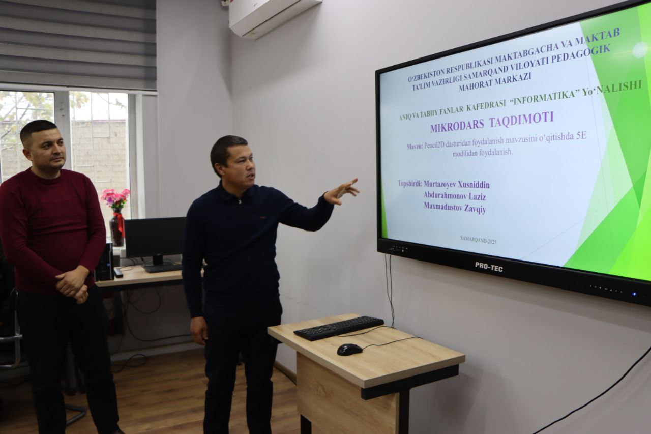 Kursning yakuniy bosqichida tinglovchilar o‘z loyiha ishlarini himoya qilib, mikrodars taqdimotlari orqali o‘quv jarayonini samarali tashkil etish bo‘yicha mahoratlarini namoyon etdilar.