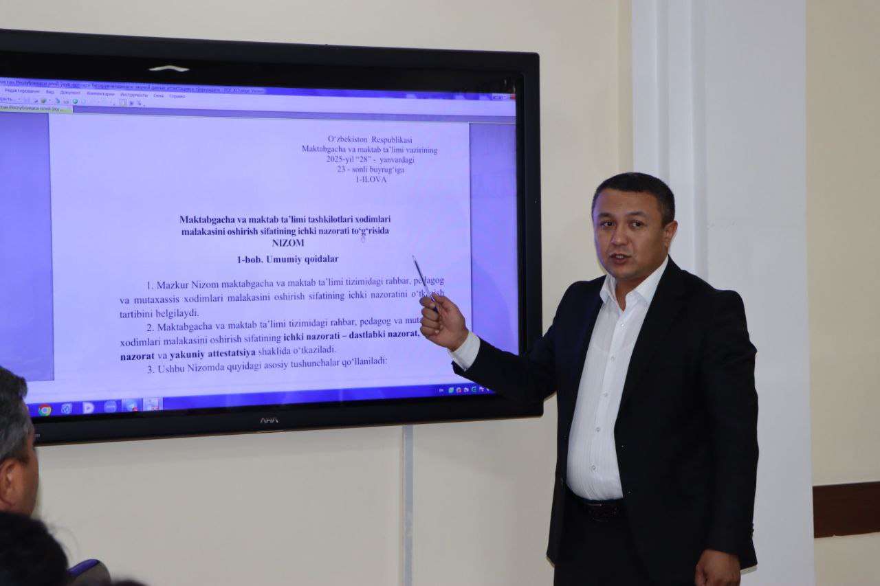 Anvar Sobirov yig‘ilish ishtirokchilariga o‘z takliflarini bildirdi va ta’lim jarayonini yanada takomillashtirish bo‘yicha muhim vazifalarni belgilab berdi.