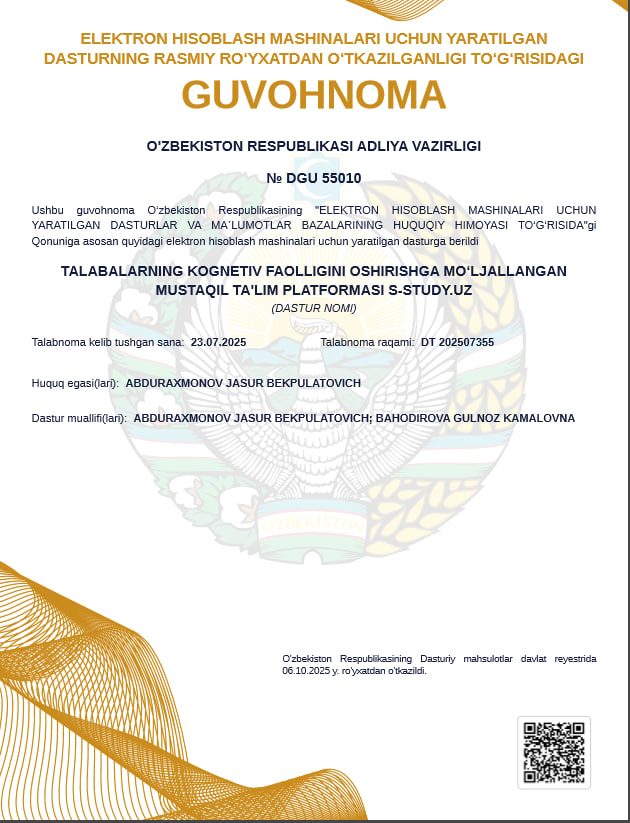 Samarqand viloyati pedagogik mahorat markazi Maktabgacha ta'limni muvofiqlashtirish bo'limi boshlig'i Abduraxmonov Jasur Bekpulatovich Talabalarning kognitiv faolligini oshirishga mo'ljallangan " S-STUDY" nomli mustaqil ta'lim platformasini yaratganligi uchun Adliya vazirligining guvohnomasiga ega bo'ldi.